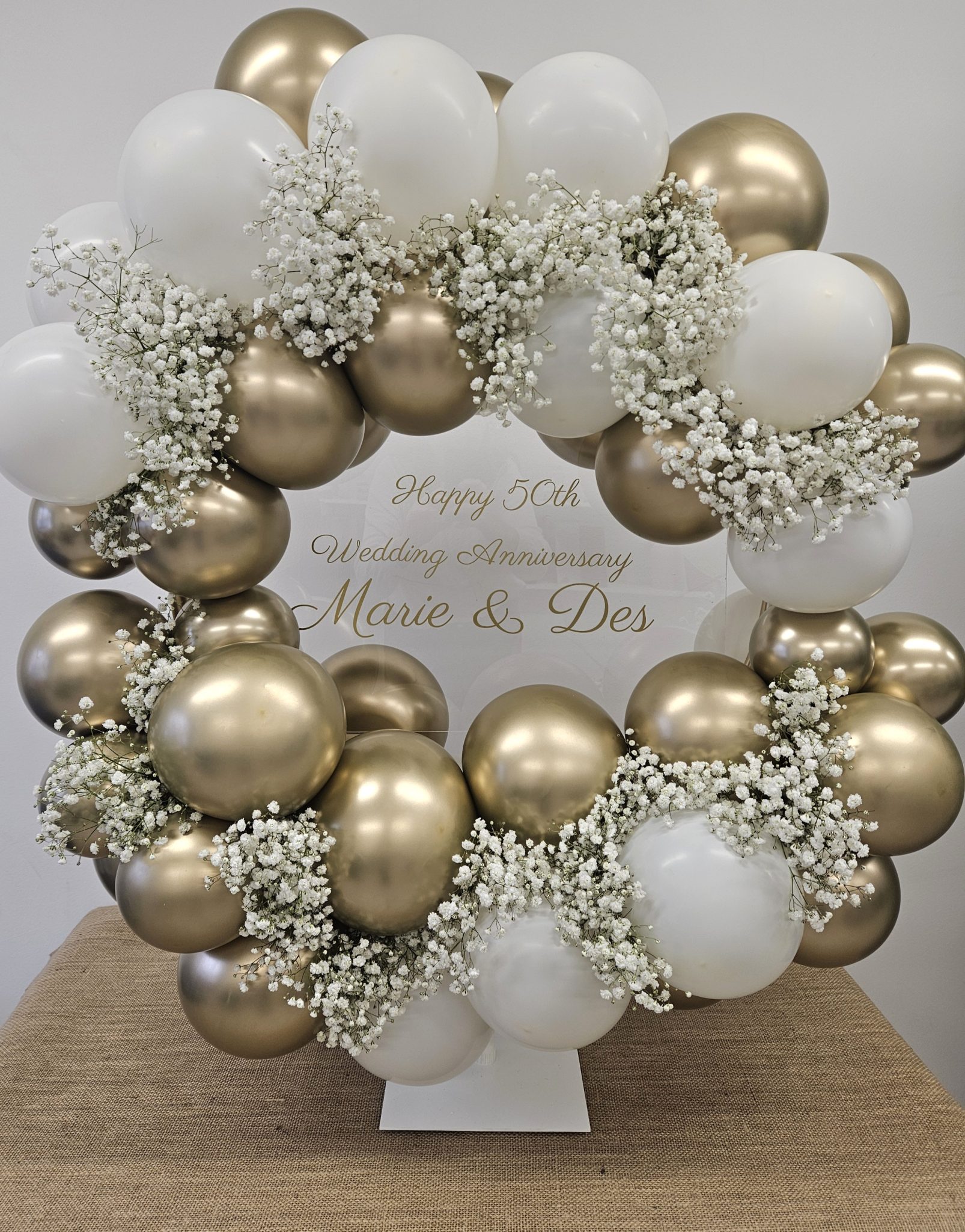 Our Balloon Hoops are a show stopper. A really beautiful piece of balloon art if we do say so our selves. The perfect gift or decoration for any party big or small. Because the are air filled (not helium) they last weeks still looking as adorable as day 1! Then your personalised message or wish in the middle of the hoops is a keep sake for ever.